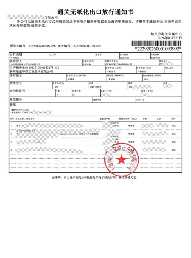 보도에 따르면 이번 배송 일정은 촉박하면서도 매우 효율적이었습니다. 22일에는 장비가 성공적으로 픽업되어 당일 즉시 선박에 선적되었습니다. 이어 26일에는 성공적으로 출항해 수로를 통해 장비를 캄보디아까지 운송했다. 이번 납품은 국경 간 물류 관리 분야에서 Lvquan Environmental의 매우 효율적인 실행 능력을 보여줄 뿐만 아니라 인쇄 산업을 위한 산업 폐가스 처리 분야에서 선도적인 기술 위치를 보여줍니다.