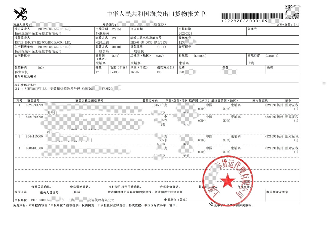 세부 사항을 참조하십시오[캄보디아 프놈펜, 2026년 3월 22일] — Lvquan Environmental Protection Engineering Technology Co., Ltd.는 최근 캄보디아 고객인 INTEX INDUSTRIES (CAMBODIA) CO., LTD에 고급 인쇄 배기 가스 처리 장비 세트를 공급하는 중요한 국경 간 배송을 성공적으로 완료했습니다.